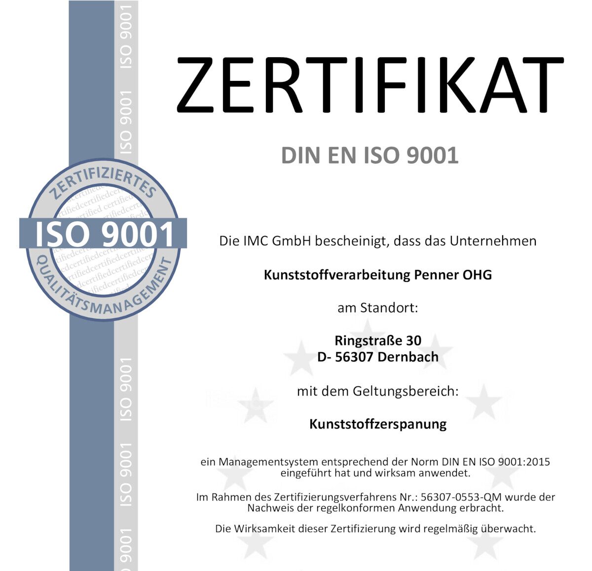 Wir - Kunststoffverarbeitung Penner OHG - sind nach DIN EN ISO 9001:2015 zertifiziert. Wir planen, organisieren und kontrollieren langfristig und stetig die Qualität unserer Arbeitsprozesse, Produkte und Leistungen für das bestmögliche Ergebnis.